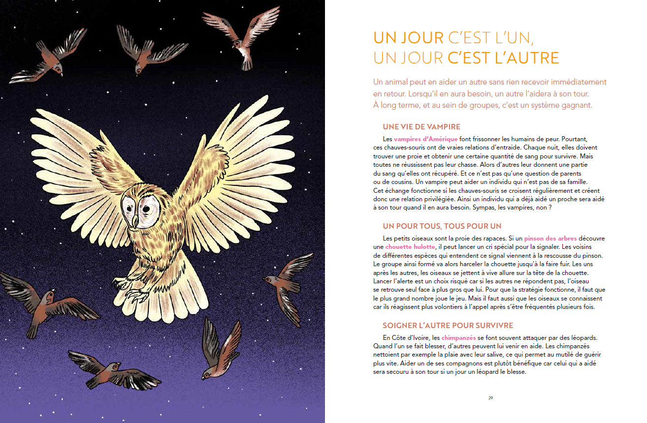 Depuis la théorie de la sélection naturelle de Darwin, beaucoup ont conclu que la compétition était le comportement majoritaire dans la nature. Pourtant les biologistes et les éthologues montrent aujourd’hui à quel point c’est faux. Car les espèces sont capables de s’entraider. C’est même pour plusieurs d’entre elles l’unique moyen de survivre. Crevettes et poissons, plantes et fourmis, saules et castors sont autant de “duos” d’espèces qui s’entraident pour le meilleur ! En 12 chapitres, on découvre les différents types de collaboration qui existent dans les milieux naturels ?: les plantes qui se servent des insectes pour la reproduction, celles qui servent d’abri ou de nourriture (voire des deux) aux animaux, les gros animaux qui servent de moyen de transport aux plus petits… On trouve même de vraies nounous chez certaines espèces comme les suricates ?!
